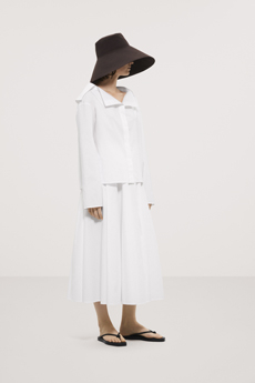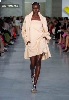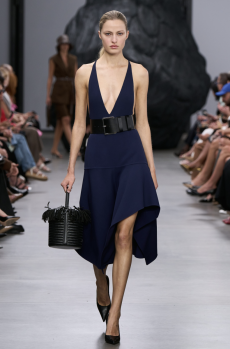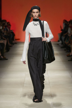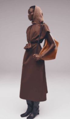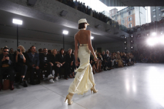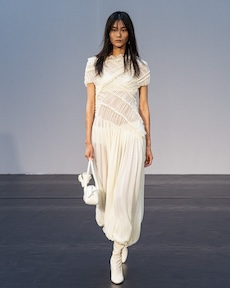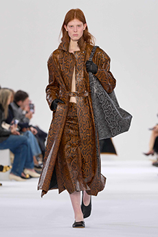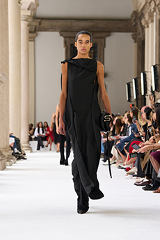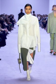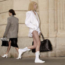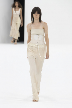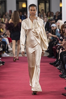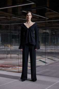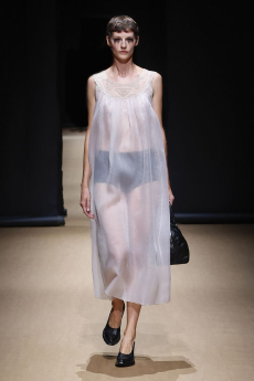 Unexpected pairings dominated: draped tops with wide-leg chinos, strapless dresses with cigarette trousers, and trench coats reengineered with pleats for a floating effect. Details like practical pockets, back-fastening knits, and asymmetrical cuts added functionality to elegance. Accessories - including flat leather bows, ultra-thin sneakers, and the Revers bag, shaped like a blazer lapel - grounded the looks with quiet edge.
