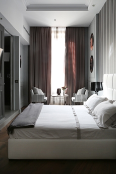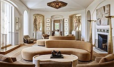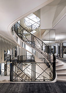 Additional details include fluted glazed ceramic niches, contemporary interpretations of Venetian Stucco Antico, and bronze-clad classical moldings. At the center, a striking eucalyptus wood staircase forms both a sculptural void and a connecting thread across levels.