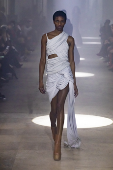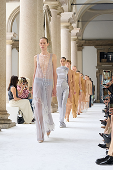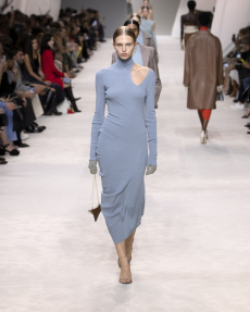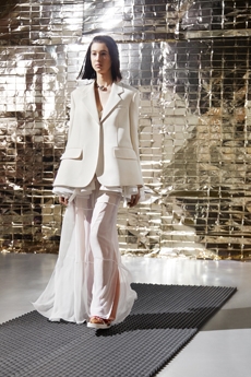 The collection navigates this delicate balance with fluid silhouettes that shimmer with lightness, while sharp cuts and precise details preserve Givenchy’s signature architectural sophistication. Fabrics float and cling in turns, as Burton channels a refined strength that feels both intimate and commanding.