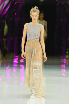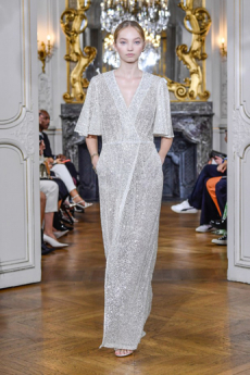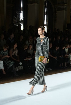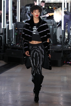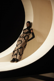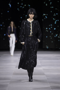 It does not surprise that the humongous double C rocket was designed to lift off for more than 10 meters in the finale, leaving us completely stunned in smoke and pyrotechnic lights with Elton John’s Rocket Man in the background, Lagerfeld playfully used a whole vocabulary of space references: metallic matelassé stoles in silver and pink as space blankets, knitted headbands lifting the hair into a voluminous round cloud hinting to the space suit helmet, heavenly beaded black evening dresses to match the stardust castellated sky.