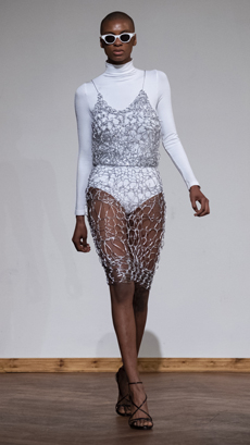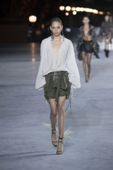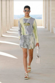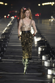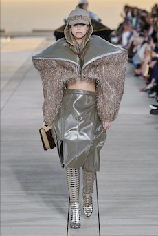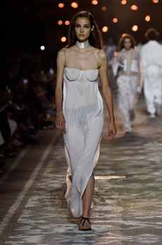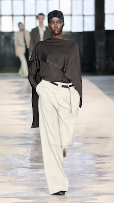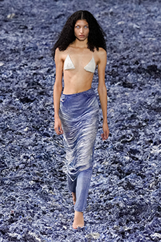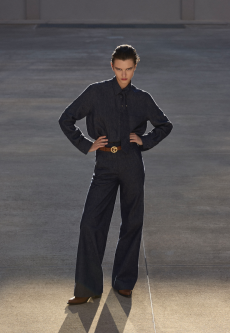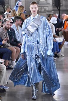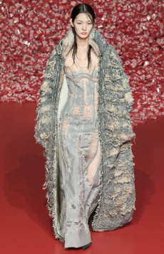 The progression unfolds like a score: first, a blank overture of elongated dresses, loose tailoring, cargo pants, and flowing shirts. Then, a bolder interlude: sponged leathers, acid-etched denim, airbrushed knits. Finally, a crescendo of sinuous shimmer, sculptural and silvery, closing the arc in luminous fluidity.