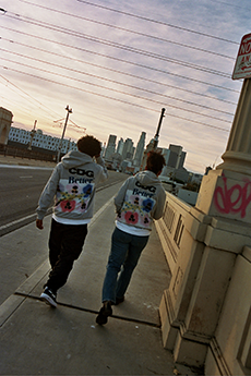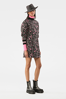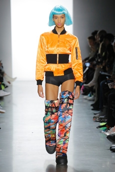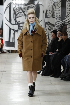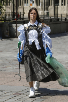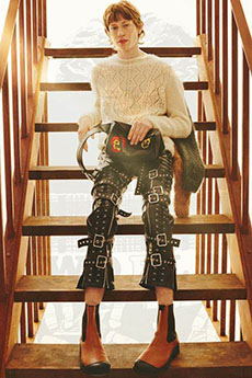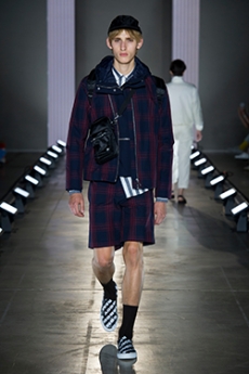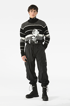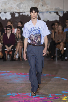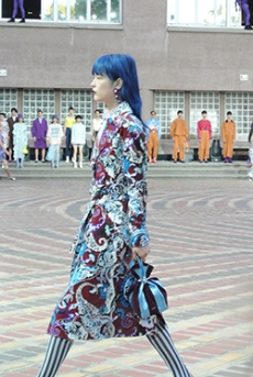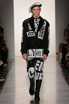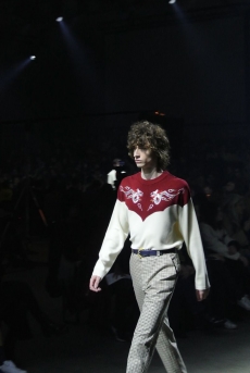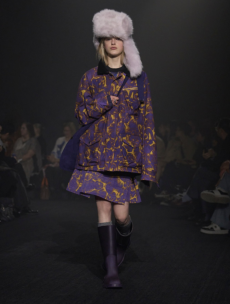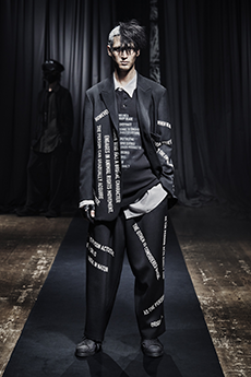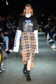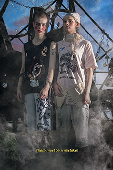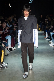 Tartan motifs and schoolboy sheepskin jackets collectively pay homage to College fashion. With slogans like “I Don't Like Drugs but Drugs Like Me” or “Too Fast to Live Too Young to Die” making appearances throughout the line, Morikawa's collection echoes messages from modern society.