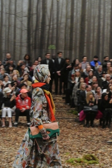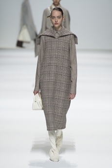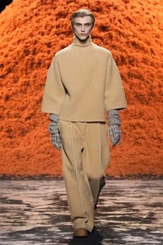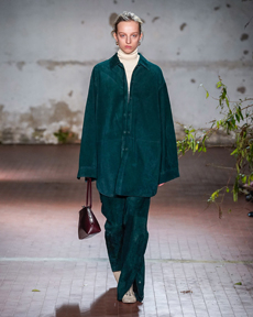 The spectacular set design featuring real fading leaves and shedding trees inside the harsh concrete brutalist UNESCO building, wraps the collection in a surreal atmosphere. As we walk inside the venue we feel overwhelmed by this recreated landscape. It almost urges you to just take a stroll and roll in what looks like a wintery park’s forgotten route.