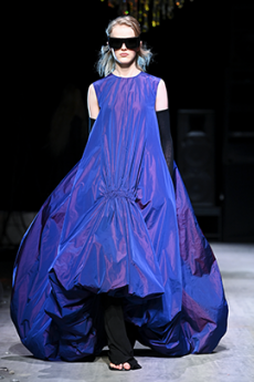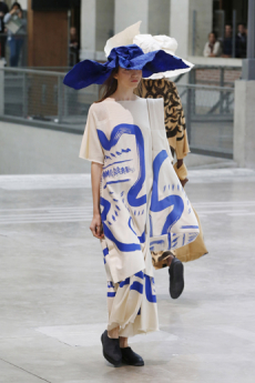 And it’s the search for the perfect balance of draping around the female body the protagonist of the collection. The gracious volumes protruding along the figure with bias cut, deconstructed, rigorously in black with hand-painted splash of purple and blue. Painting has always been a beautiful obsession for the Japanese designer and we know he would never refrain from expressing the refuse to use print patterns.