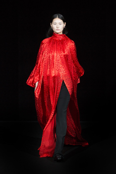Silk canvas, tussah silk, cashmere gauze, silk moiré, Nappa, denim — each fabric is allowed to speak in its own tongue, its natural hue preserved save for flashes of Ferrari red. From butter-white to magma rust, color exists only to amplify the tactility of material. Silhouettes are elongated, vertical, resolute; volumes envelop the body, glorifying movement. Form honors function, yet remains poetic.