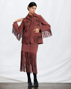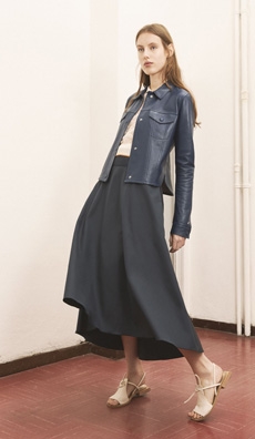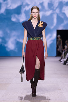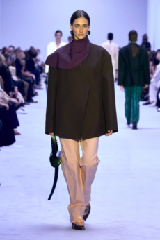 A beautifully timeless wool long cape in midnight blue lined in a rosy dusty brick tone and paired with a sporty ribbed sweater and tights. A sweeping floor leather coat in pale powder pink. Classic cut pants and laced-up thigh-high boots as borrowed from man’s wardrobe. Relaxed turtleneck knits matched with statement patchwork leather outwear with shearling trim. But also 70s vibes with scarf dresses in mousseline. Vanhee-Cybulski is revising the codes of haute modern dressing for this equestrian-routed French maison.