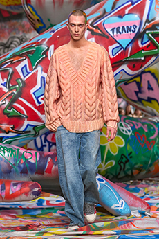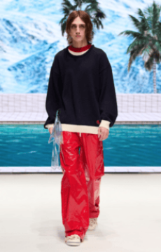 The collection reimagines the exuberance of past decades — Fiorucci’s own heyday of pop culture and nightlife — through the lens of today. Candy pinks, acid yellows, and electric blues animate structured jackets, cropped knits, and sharp-cut denim, while archival graphics find new life across tees and outerwear. The mood is rebellious yet optimistic, a wardrobe designed to be lived in with spontaneity.