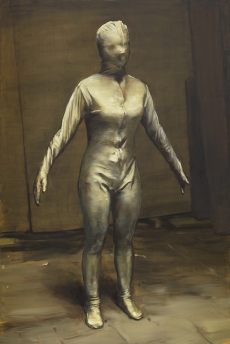 In muted shades of black and grey, with only the thinnest veil of oil wash in faded aquamarine or yellow, the overall impression of the palette is decidedly monochrome. The figures are resolutely not portraits; the final creation is given by a work of research through images of unknown people like photos, sketches, ripped pages of magazines, combined with her drawing and creativity, in order to give birth to an incredible mix between classic paintings and current graphic novels.