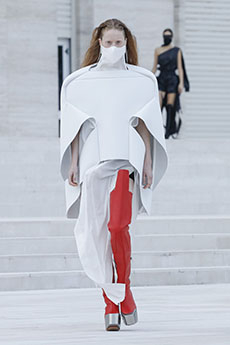 Forty-four looks of pure architectural shapes, and virtuosic silhouettes in a crescendo of emotions. As Yamamoto once again recorded his own guitar playing for the show music, it’s almost as if we could see him, in his home, sitting down and casually strumming his acoustic guitar, in search for fragments of time, emotions, images. Singing about a woman, the archetype of the woman itself.