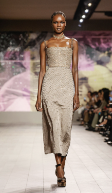 The runway presentation married Dior’s legacy with Anderson’s distinctive eye. He opened the show with a structured, strapless white hourglass dress with bold bows — a nod to the brand’s heritage, reinterpreted through a contemporary lens. His vision leaned into contrasts — tailoring sharpened, silhouettes pushed, and classic codes disrupted by origami folds, cropped Bar jackets, and open capes. Anderson addressed the tension between dressing up and dressing down, weaving softness and structure into a collection that feels both familiar and daring.