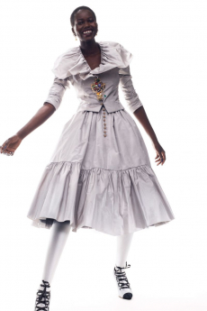 The runway felt like a catalogue of textures: industrial drill and raw canvas embroidered with meticulous stitchwork, muscular leathers beside silk cloqué and frayed lace. Documentary echoes—Dorothea Lange’s uncompromising factory frames and Helga Paris’s intimate study of labour—gave the clothes a documentary gravity. Ruffles, traditionally frivolous, were retooled into a vocabulary of endurance—sweetness edged with toughness, a flirtation with contradiction that felt wholly contemporary.